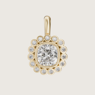 Sculptural sparkle under sun-kissed skies. A bold bezel halo of diamonds cradles your chosen diamond size - a desert night bloom caught in the light. Decadent and sculptural, it’s a pendant that commands attention, finished with a statement bale to pair effortlessly with your favourite gold chain.